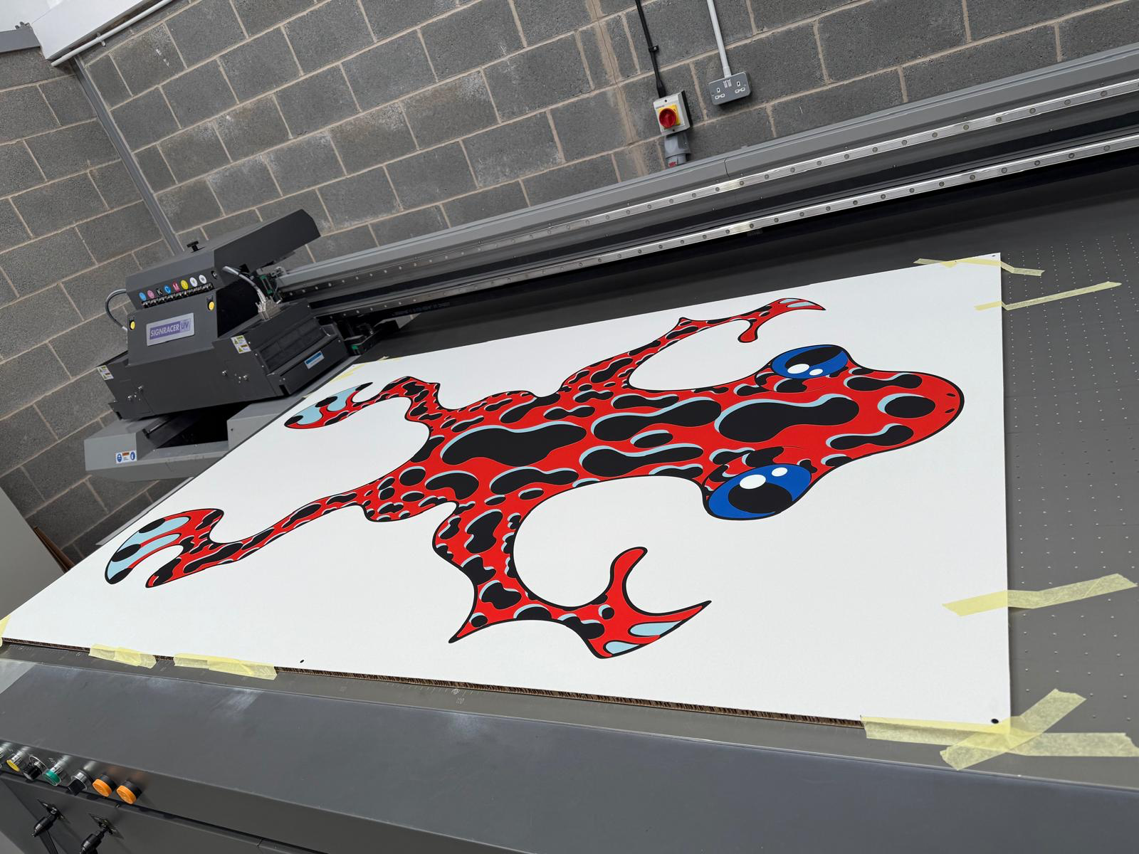 Following consultation, IPS recommended using 10mm Xanita board — a lightweight, rigid, and fully recyclable fibreboard that delivers premium print quality without the drawbacks of traditional foamboard. With its smooth bright-white surface and strong Kraft-core structure, Xanita met all performance requirements while aligning with the eco-conscious spirit of the installation. To enhance the tactile quality of the frogs in the mural, IPS proposed adding dimensional texture using a braille-style print technique. A sample was produced on the Signracer HD UV printer, using a layered ink build-up (excluding white) to create a raised print effect that Sam quickly approved. Once the artwork was finalised, each piece was precision-cut on the VeloBlade Nexus flatbed cutter, followed by thorough quality checks. Packaging was just as crucial as the print: IPS provided secure, flat-packed delivery to ensure the pieces arrived at the V&A in perfect condition – ready to be suspended as part of Sam’s collaborative mural experience.